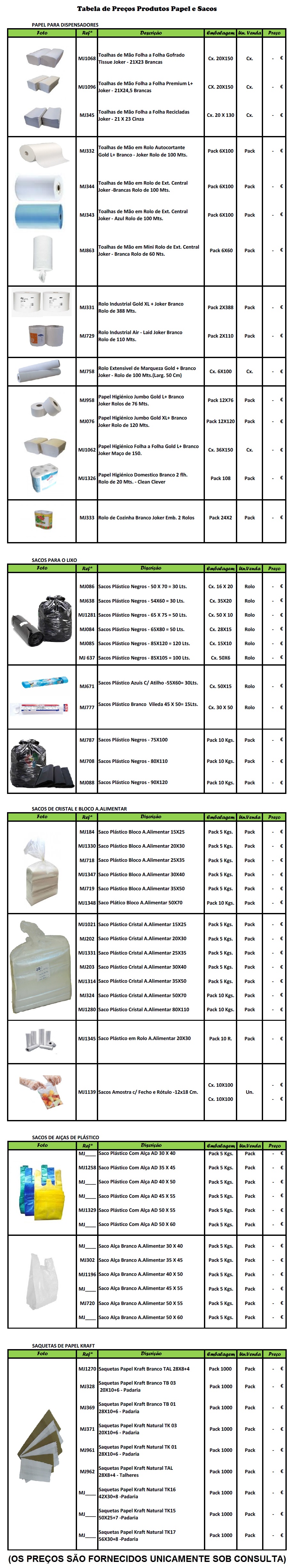 Produtos Papel e Sacos (Papel para Dispensadores, Sacos Lixo, Sacos Cristal e Bloco Área Alimentar, Sacos Plástico Alças, Saquetas Papel Kraft e Outros)